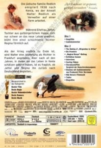 | Disc 1: Hauptfilm Audiokommentar Disc 2: The Making Of "Nirgendwo in Afrika" Die Premiere "Magical Kenya"-Beitrag Entfallene Szenen Interviews Casting Videos Storyboard/Film Vergleich der Heuschreckensequenz Diashow mit Audiokommentar von Produzent Peter Herrmann Niki Reisers Filmmusik Trailer Biografien |